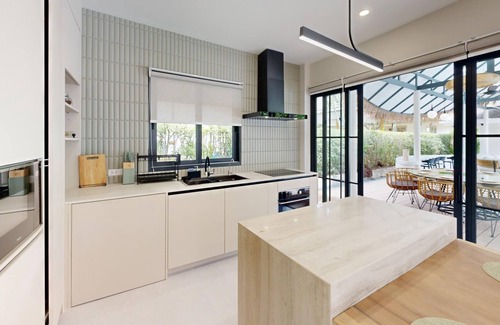 While you're here, you can enjoy all the comforts of home and more, including a rainfall showerhead and a full-sized refrigerator/freezer, as well as an oven and a stovetop. Other amenities include Egyptian cotton sheets, designer toiletries, premium bedding, and a Select Comfort bed.