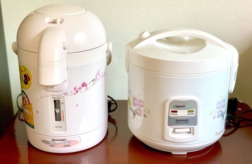 fully equipped kitchen with stove, refrigerator, microwave, kettle, rice cooker and toaster