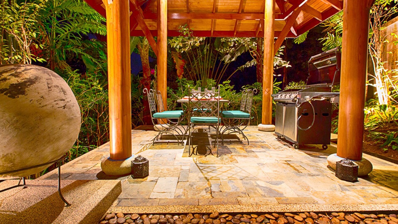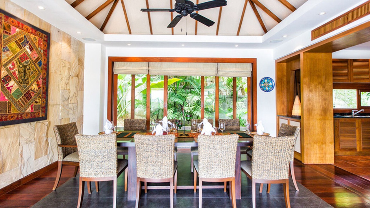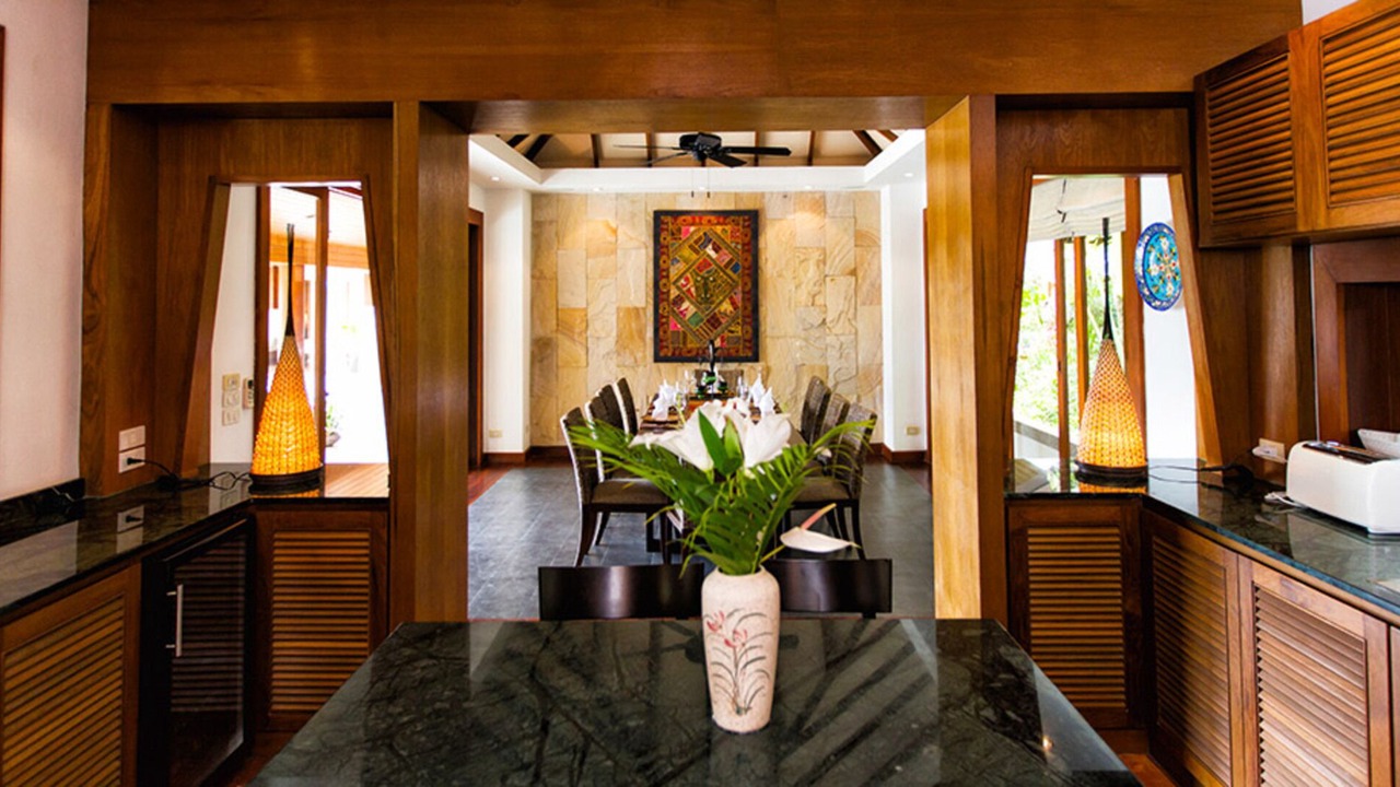Traditional Thai pitched-roof pavilions front the villa’s private and communal accommodation which is configured in three spacious bedroom suites, a comfortable and inviting living room, fully-equipped entertainment room, modern kitchen and functional dining room, while tropical outdoor living focuses around the villa’s refreshing 8-metre pool.
